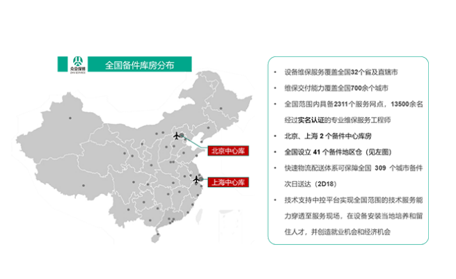 向客户提供覆盖全国超过1400个县市的售后服务资源,包括13000名工程师、2300家服务站、41个备件库房,具备备件次日达运输能力的319个城市。