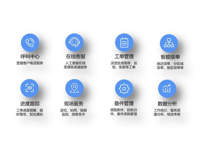 基于设备特性与服务场景以设备全生命周期管理与三单合一为指导思想,形成覆盖人、财、物与信息流的售后服务交付端到端管理能力。